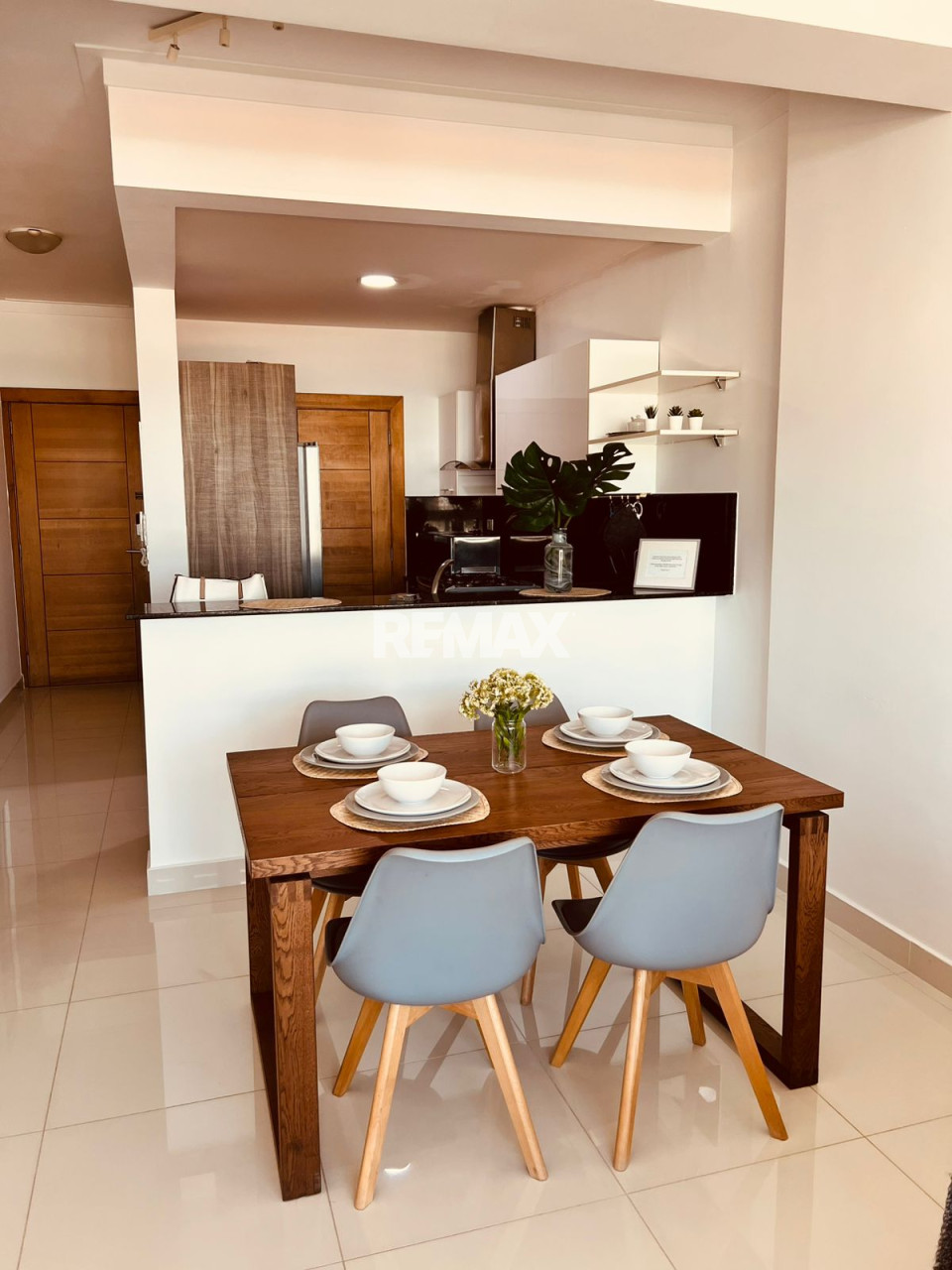 Con 97 metros cuadrados de construcción completamente amueblado, cuenta con 2 habitaciones y 2 baños, ideales para familias o parejas. La propiedad incluye una sala-comedor iluminada con buena vista, cocina equipada y desayunador.
